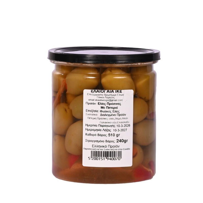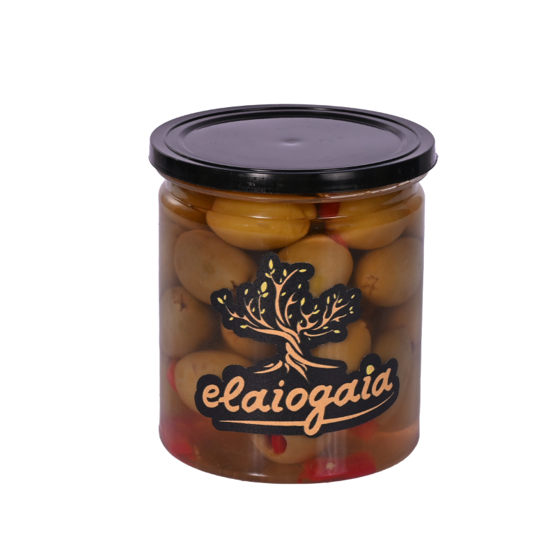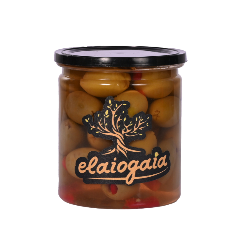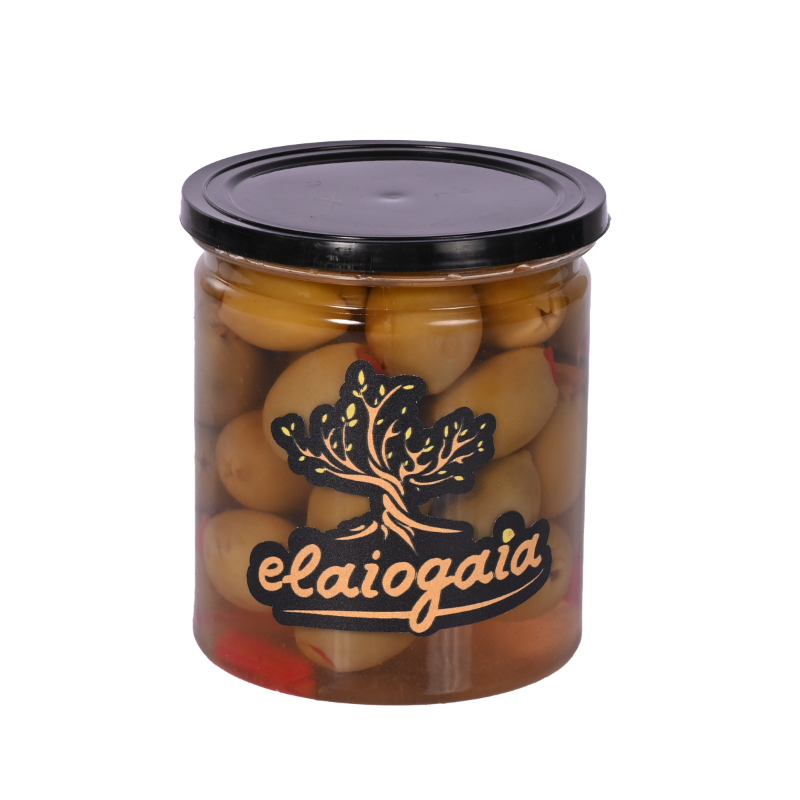 Πράσινες Ελιές με Πιπεριά 450ml υψηλής ποιότητας από την Elaiogaia. Παραδοσιακή ελληνική γεύση, προσεκτική επιλογή καρπών και ιδανική συσκευασία για καθημερινή κατανάλωση ή επαγγελματική χρήση.